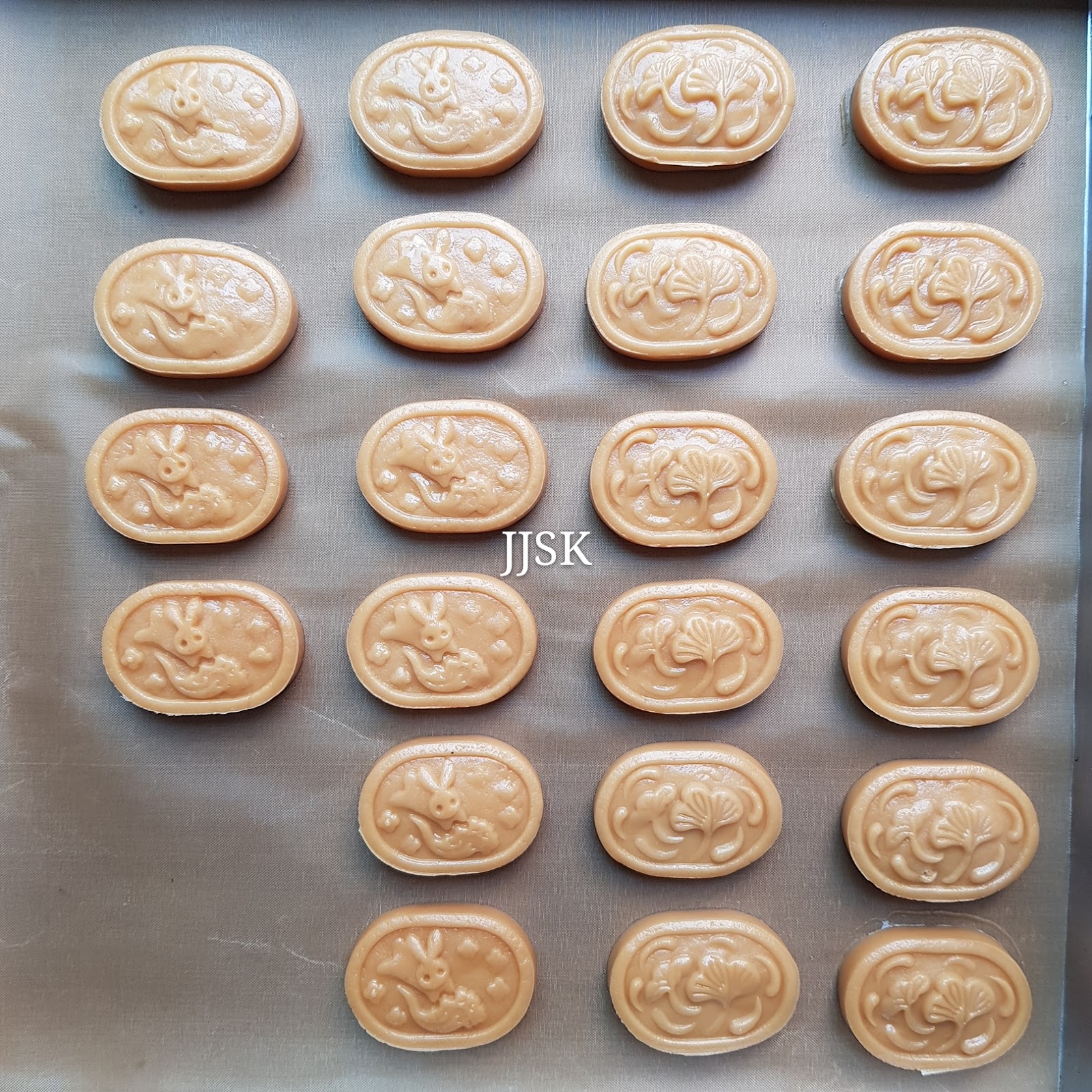 印好后的公仔饼,烘烤第一次,取出待微凉(10分钟)。