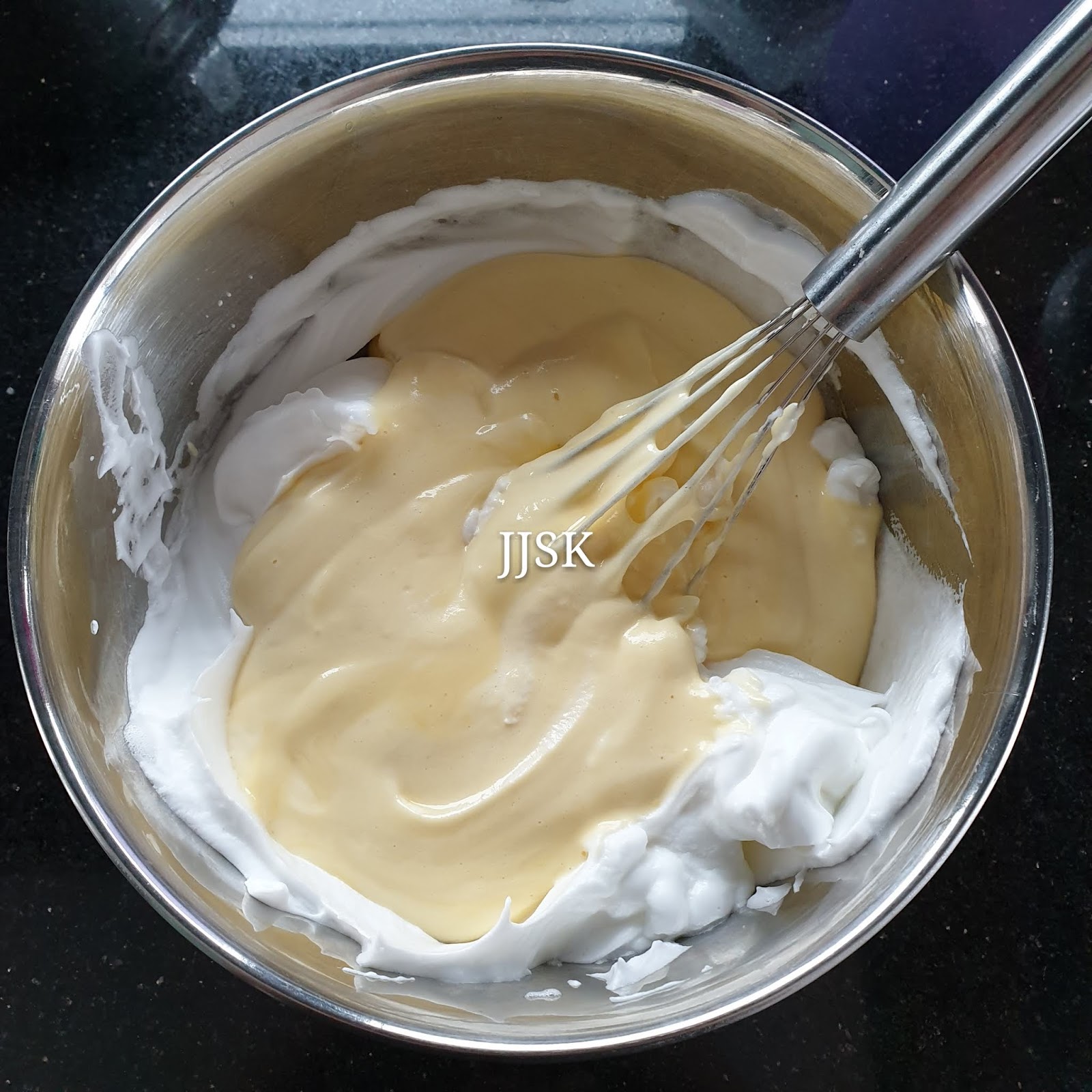 然后倒入剩下2/3的蛋白里拌均匀,即成戚风蛋糕糊。